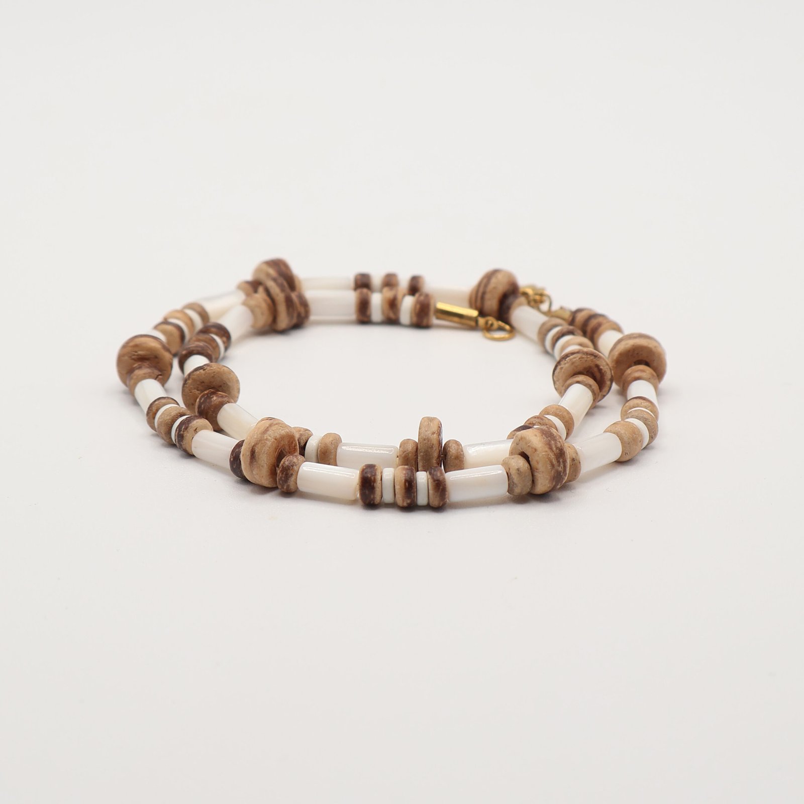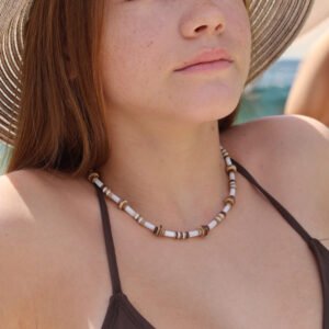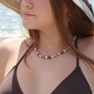 Hand-strung bead by bead, this piece pairs smooth natural shell tubes with organic coconut discs, creating a beautiful balance of creamy neutrals and earthy texture. The contrast is subtle yet striking — relaxed, refined and effortlessly coastal ✨